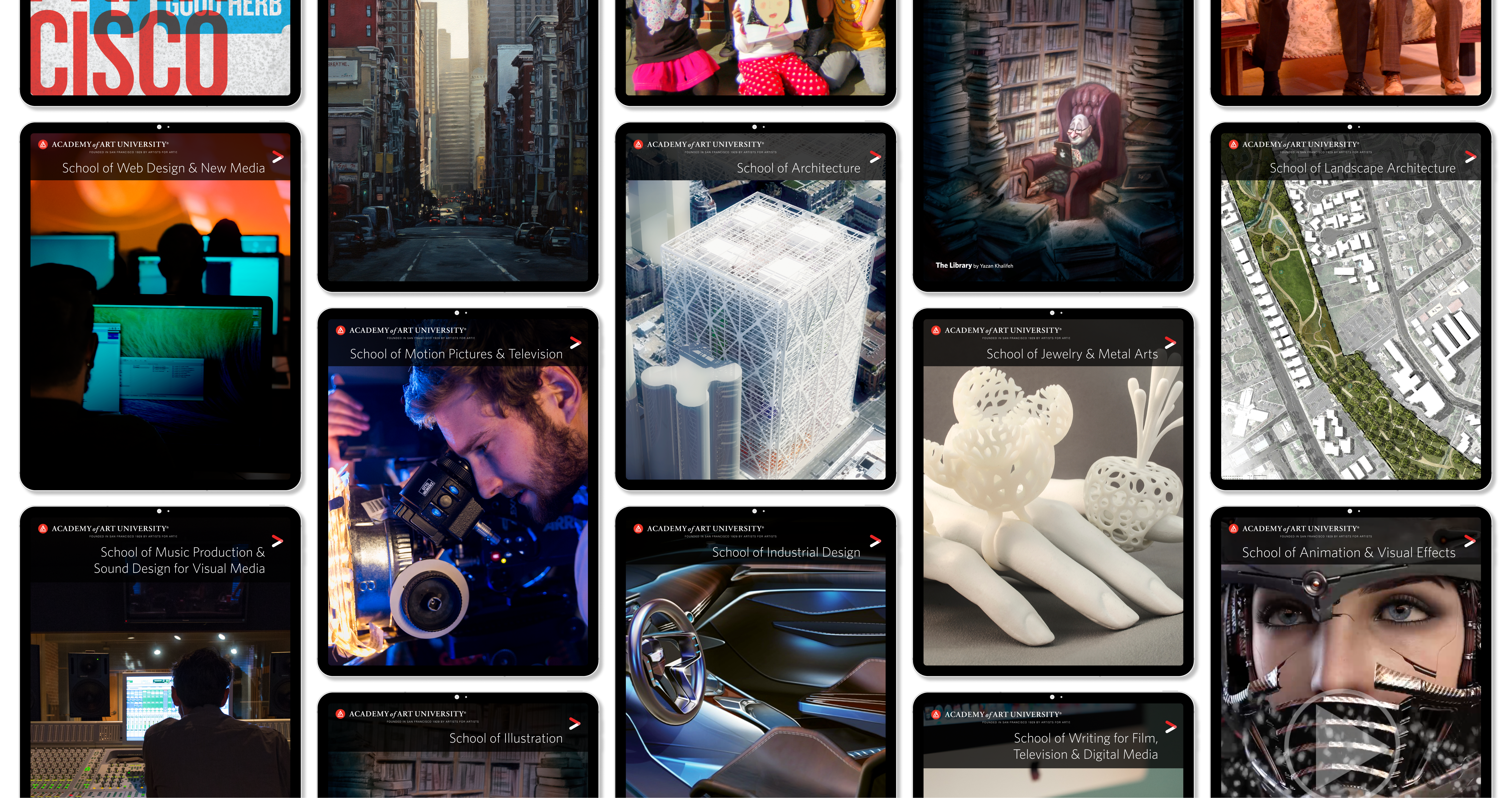 My time at the Academy of Art University started with building the Mobile Press department from the ground up alongside a colleague. It was a new initiative focused on creating interactive digital experiences for prospective students. What began as an experiment in mobile publishing grew into a cornerstone of the Academy’s recruitment strategy. Over time, my role expanded from designing interactive iPad brochures to leading broader marketing design efforts, unifying how the university presented its programs across digital and print channels.